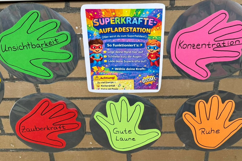 Gegenüber der Blumenwiese hängt jetzt auch eine Superkräfte-Aufladestation. Hier können sich alle, die es brauchen, mit einer Superkraft aufladen! Aber Achtung! Bei zu langer Ladung können Nebenwirkungen wie extra viel Power oder ein Lachanfall auftreten!